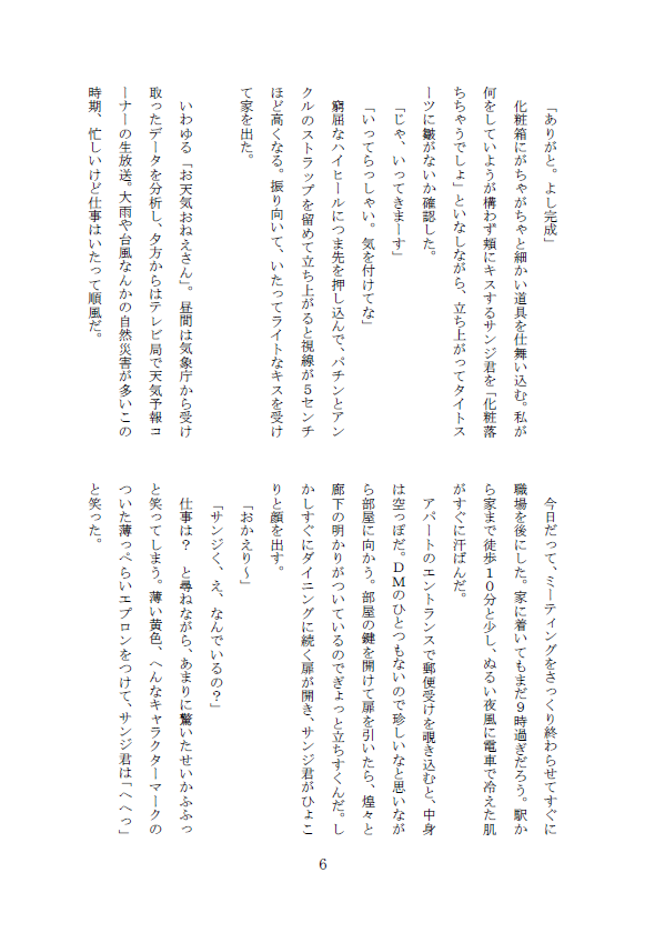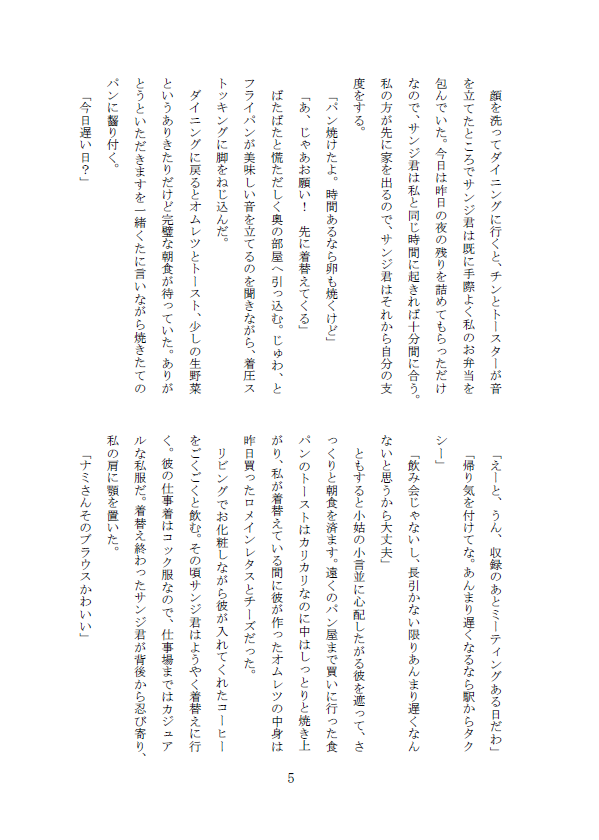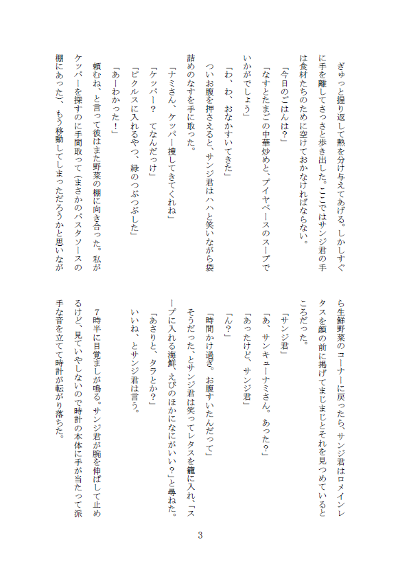 朝ごはんとか掃除とか洗濯とかチャンネル争いとか、細かいネタを乱発して好きに貪るためだけに置いてた話なので、本も一応全部繋がりはあるけども、私が考える一緒に暮らすサンナミのシーンを切り取ってべたべた貼り付けて繋げたみたいになりそう。